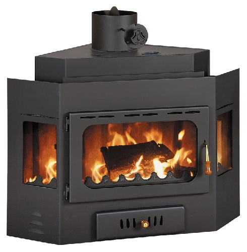 Výkonná rohová krbová vložka. Je vyložena šamotovými deskami, součástí je litinový rošt. Přívod primárního vzduchu je regulovatelný přes popelník, sekundární vzduch oplachuje sklo a nelze jej regulovat. Terciální vzduch ani přívod vzduchu z exteriéru u krbové vložky není. Materiál: 3 a 4 mm plech. Samovypalovací černá barva