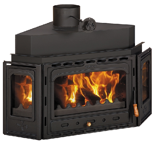 Výkonná rohová krbová vložka s litinovými dvířky a bočnicemi. Je vyložena šamotovými deskami, součástí je litinový rošt. Přívod primárního vzduchu je regulovatelný přes popelník, sekundární vzduch oplachuje sklo a nelze jej regulovat. Terciální vzduch ani přívod vzduchu z exteriéru u krbové vložky není. Materiál: 3 a 4 mm plech. Samovypalovací černá barva