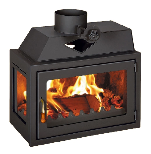Výkonná krbová vložka s levým bočním prosklením. Je vyložena šamotovými deskami, součástí je litinový rošt. Přívod primárního vzduchu je regulovatelný přes popelník, sekundární vzduch oplachuje sklo a nelze jej regulovat. Terciální vzduch ani přívod vzduchu z exteriéru u krbové vložky není. Materiál: 3 a 4 mm plech. Samovypalovací černá barva