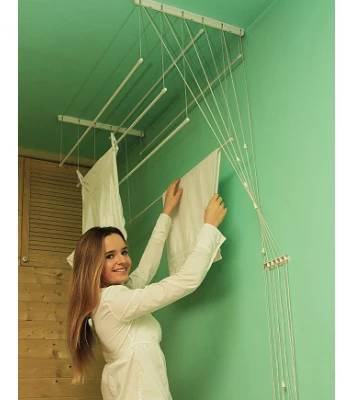 Sušák se skládá ze 6ti samostatně ovladatelných tyčí. Rozestup mezi tyčemi je 9,5 cm, šířka lišty s kladkami je 55 cm. Celková nosnost 18 kg.Prádlo u stropu rychleji schne, nepřekáží a nevytváří se na něm ostré hrany jako při sušení na šňůře.